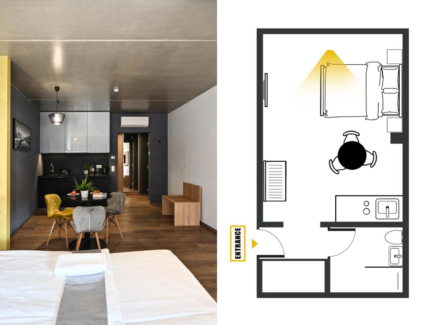 Studio. Studio with combined living and sleeping room, a kitchenette, and a balcony.